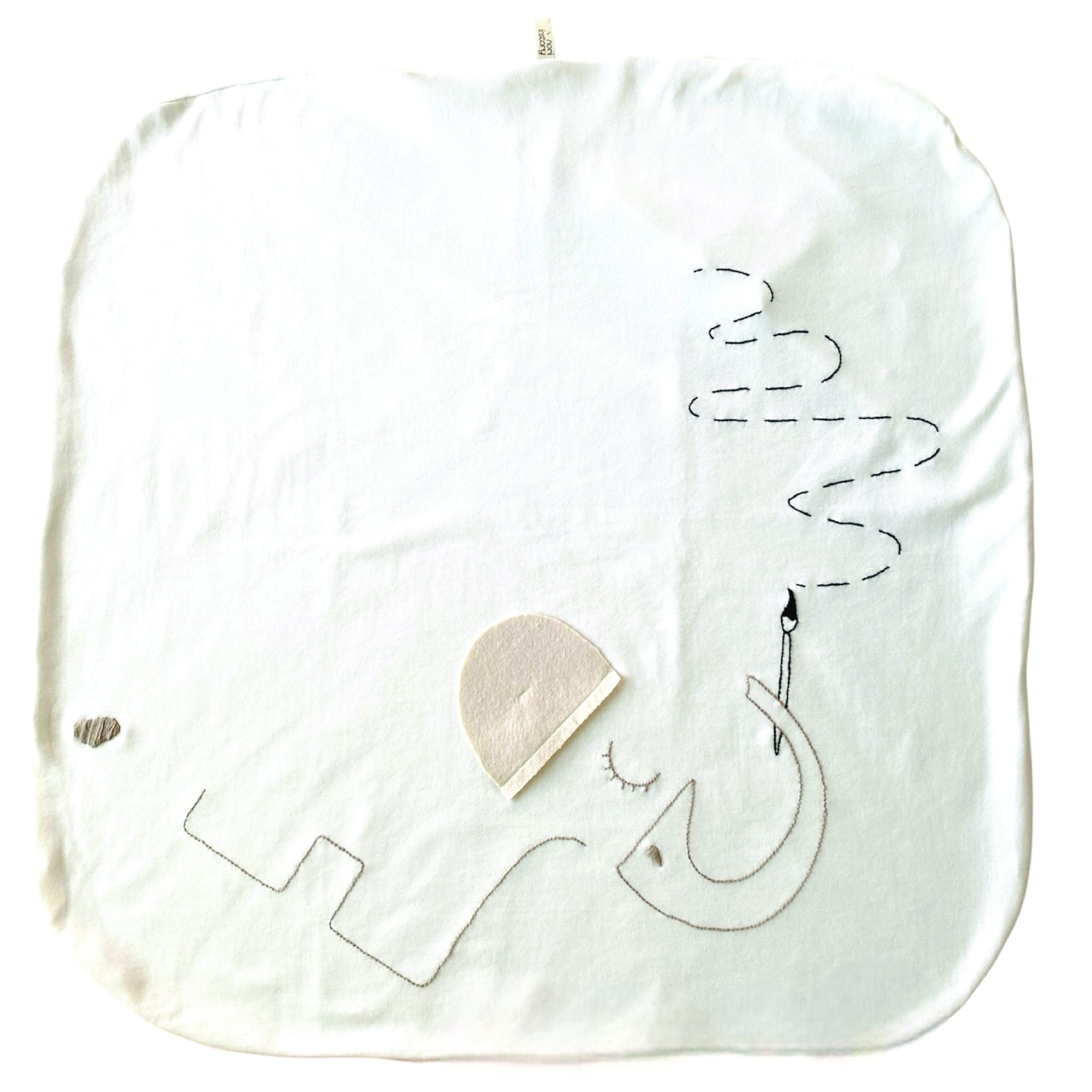 White baby quilt cover with hand-embroidered elephant Phanty holding a paintbrush